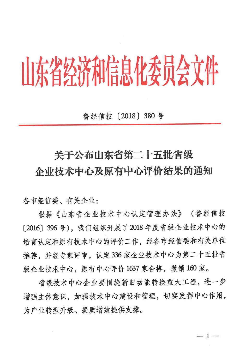 2018年10月23日,經(jīng)過山東省經(jīng)信委組織專家評審,公司被認(rèn)定為“山東省省級企業(yè)技術(shù)中心”。